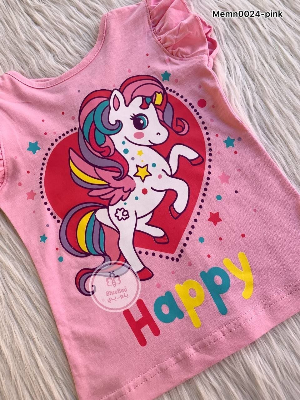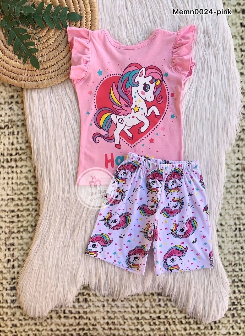 بجامه بناتي قطعتين رسمة يونيكورن بينك +شورت يونيكورن ابيض